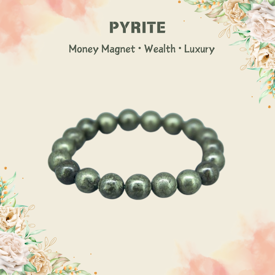 Natural Pyrite Bracelet, also known as the Money Magnet Stone. It’s a powerful crystal to attract wealth, prosperity, and protection that has been valued for centuries in both astrology and crystal healing.